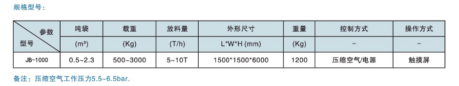 通過人工操作自動吊葫蘆將噸袋吊起,至大袋開袋站拍打裝置上方,人工拉出噸袋下料口,裝入氣動夾袋裝置內,按下夾袋按鈕,夾緊氣缸自動加緊噸袋下料口,人工解開噸袋口捆扎繩,開始自動放料。原料進入緩沖料罐內,通過拍打裝置的拍打,可以解除原料在噸袋內的積料和卡阻現象,使原料比較順利從噸袋落入到緩沖罐內。緩沖罐下配備有輸送螺桿,通過螺桿的計量輸送,可以達到客戶所需要的送料量,將原料輸送到客戶需要的罐體中(亦可在開袋站支架上安裝稱重模塊,去皮后,直接稱出重量)。