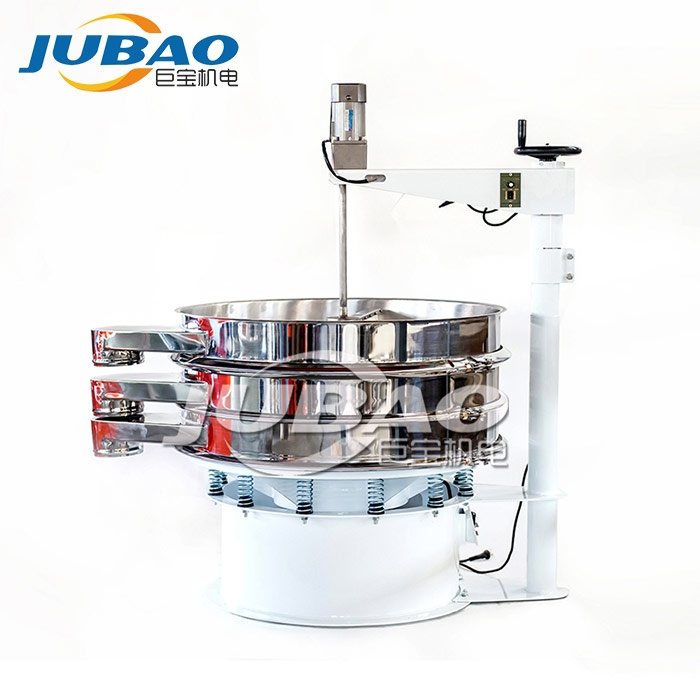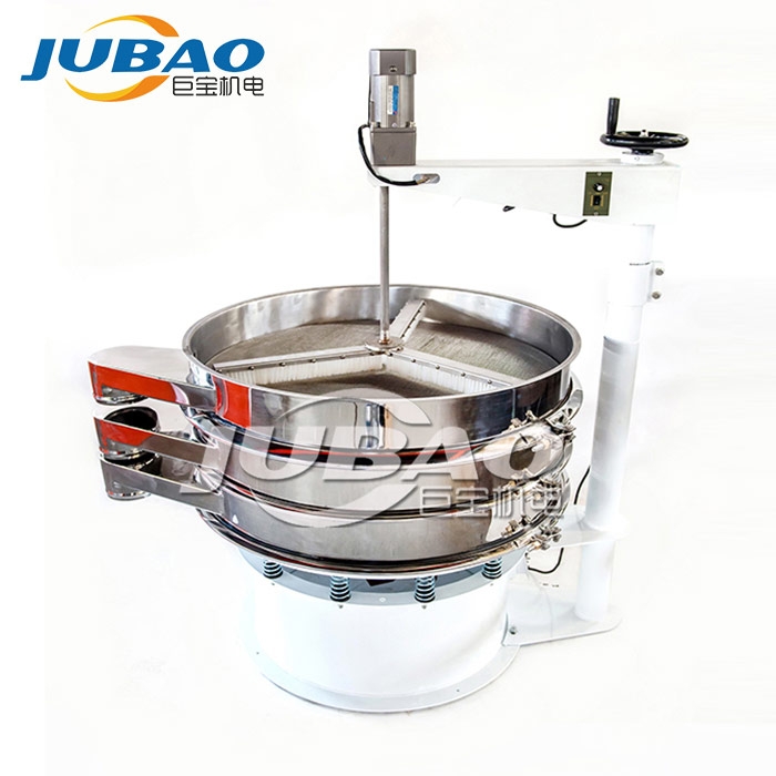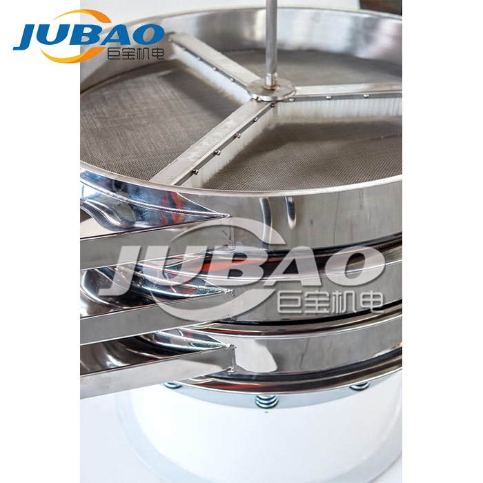 強力刮板振動篩是在圓形振動篩篩面上面新增不銹鋼刮板或者毛刷,通過刮板或毛刷給物料一個外力 ,來加速物料通過篩網的篩分速度,來提高振動篩篩分量。還可以將結團物料打散、因靜電吸附在篩網上面的物料刮離或者掃離篩面,因而把圓形振動篩的應用范圍擴展至易起靜電,易團球,易團聚的物料。例如在面粉篩分中,有些細渣子卡在網孔中,在刮板旋轉推動的作用下,可以將雜質推向出料口,自動排出,減少了堵網的發生;在固液分離作業中,能把各類漿液中的非溶性物質迅速地清除從出料口排出,防止堵網,提高篩分效率。