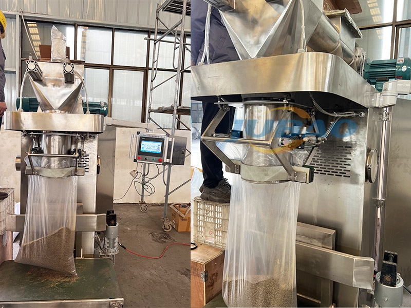 本機(jī)組由人工套袋→夾袋升降機(jī)構(gòu)→立式螺旋→立袋輸送機(jī) ,除塵系統(tǒng)及控制系統(tǒng)組成。整個(gè)流程伴隨正壓、負(fù)壓檢測(cè)系統(tǒng),整個(gè)過(guò)程由PLC等智能控制,檢測(cè)報(bào)警確保整個(gè)流程穩(wěn)定,可靠,連續(xù)運(yùn)行。螺旋給料機(jī)的出口處加裝該包裝機(jī)適用于細(xì)粉料包裝,可實(shí)現(xiàn)無(wú)粉塵包裝車間,且稱重精度非常高。