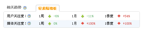隨著低碳、節能的普及,各種新型環保建材,已經具普遍的收到人們的歡迎。輕質隔墻板也以其優異的節能性能,越來越多的收到人們的關注了。我們可以從“輕質隔墻板”百度指數圖中看到非常近一個月內,因為用戶對輕質隔墻板熟悉了,所以就不再搜索輕質隔墻板的相關消息了,但是,我們可以從近3個月的總體情況看到的是,輕質隔墻板百度指數上升了54%,說明了還有有更多的用戶在了解輕質隔墻板。而從媒體百度指數看來,無論是在非常近一個月,還是非常近3個月內,輕質隔墻板的搜索量都增加了基本,從這里可以看出,輕質隔墻板的價值已經越來越多的得到了人們的認可了。