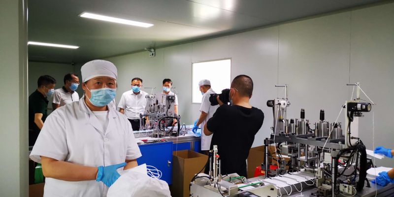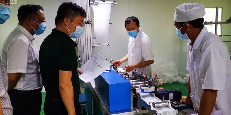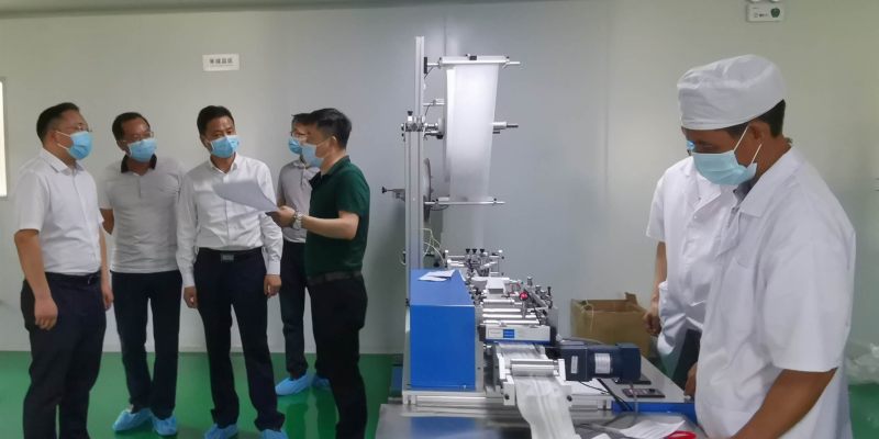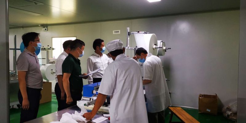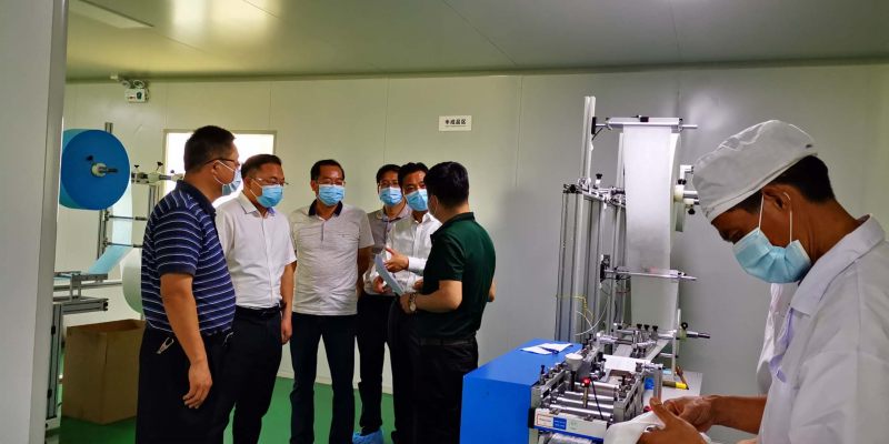 鄂州市副市長姜飛輪等領導到博悅佳有限公司檢查疫情防護物資口罩生產質量。
