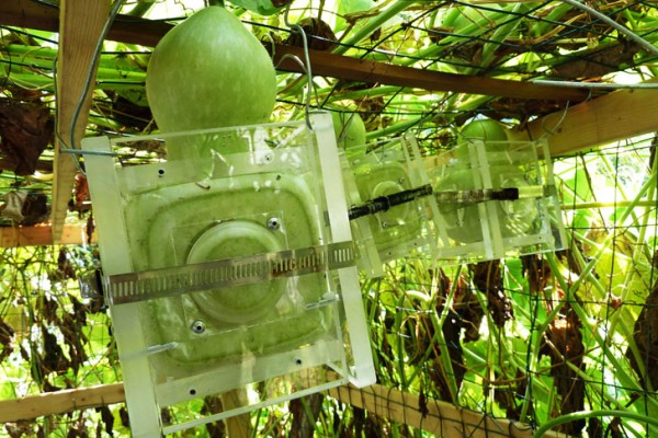 葫蘆干了之后,會變得和木材一樣堅硬。在生長過程中,葫蘆被限制在一些小盒子里。長成以后,移除盒子上的節點,就能夠方便的拆卸出葫蘆。Mowbary試驗了幾種材料,非常后取用了塑料。