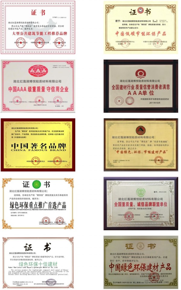 湖北博悅佳實業有限公司前身為湖北紅蓮湖博悅輕質材料有限公司,因公司發展和業務需求于二零一四年更名為湖北博悅佳實業有限公司。公司生產的輕質隔墻板、輕質隔音材料、輕質墻板、輕質防火材料、輕質防火墻板等產品具有質輕、節能、環保、高效、抗震、防火、保溫、隔音、隔熱、防水等優越性能。該系列產品更是國家十二五計劃重點推廣的新型墻體材料。博悅佳產品經國家相關部門部門檢測,其物理性均符合或高出國家最新型墻材標準JG/T169-2005要求指標。公司新型輕質墻體材料先后榮獲“大型公共建筑節能工程推薦品牌”、“中國低碳節能環保產品”、“中國AAA重質量守信用企業”、“全國建材行業質量信譽消費者滿意AAA單位”、“中國著名品牌”、“中國綠色、環保、節能建材產品”、“綠色環保重點推廣首選產品”、“全國重質量、誠信品牌聯盟單位”、“綠色環保十佳建材”、“中國綠色環保建材產品”等稱號和榮譽證書。